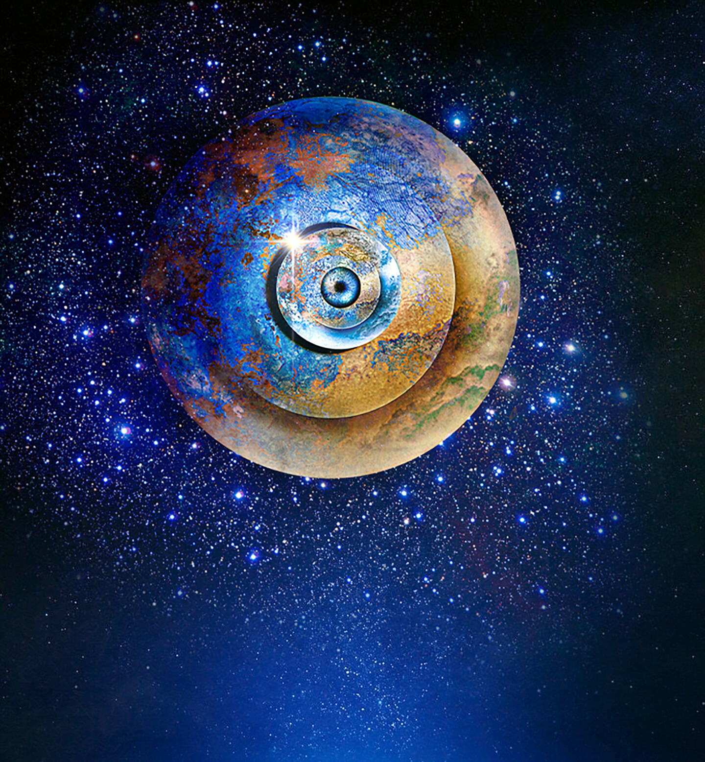 Nouvelle version de la terre matrice. Dans cette image numérique la planète semble se dédoubler mais forme un œil qui se déplace , à cause d'une éclipse ?
